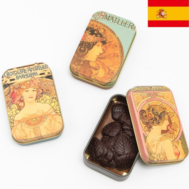 アマリエ ミュシャ缶 リーブスダークチョコレート 60g 柄3種類のうちランダム Amatller リーフチョコ スペインみやげ スペイン土産 輸入菓子 夏季クール