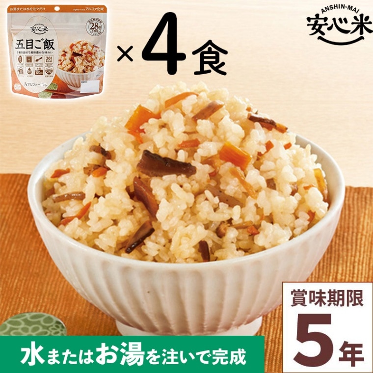 4食セット 安心米 五目ご飯 4食入 アルファ米 賞味期限5年 100%国産米 アレルギー対応 登山 キャンプ ハラール 備蓄 非常食 保存食 災害食 アルファー食品 21-0151-02