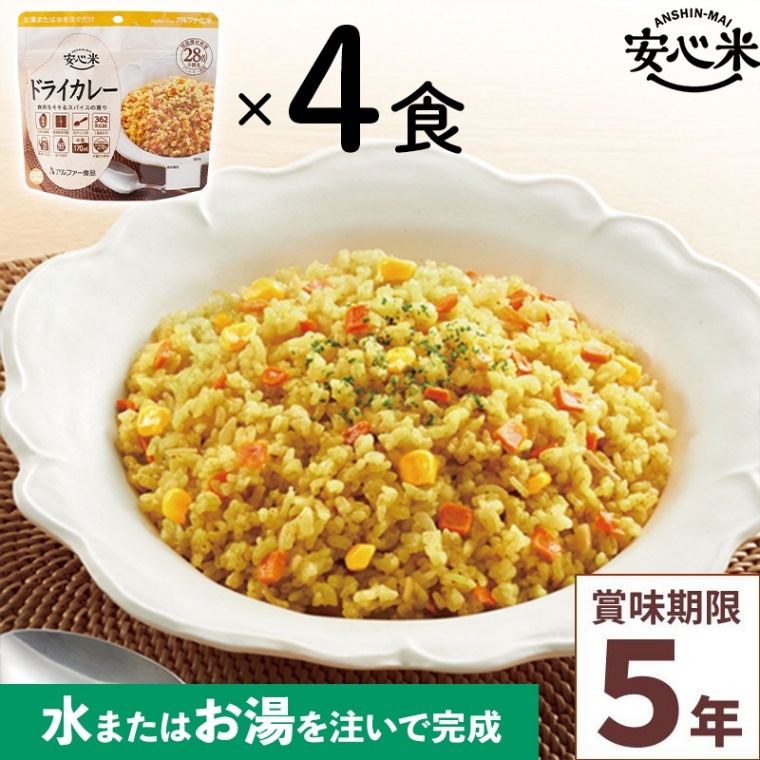 4食セット 安心米 ドライカレー 4食入 アルファ米 賞味期限5年 100%国産米 アレルギー対応 登山 キャンプ 常備 備蓄 非常食 保存食 災害食 アルファー食品 21-0151-04