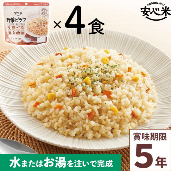 4食セット 安心米 野菜ピラフ 4食入 アルファ米 賞味期限5年 100%国産米 アレルギー対応 登山 キャンプ 常備 備蓄 非常食 保存食 災害食 アルファー食品 21-0151-05