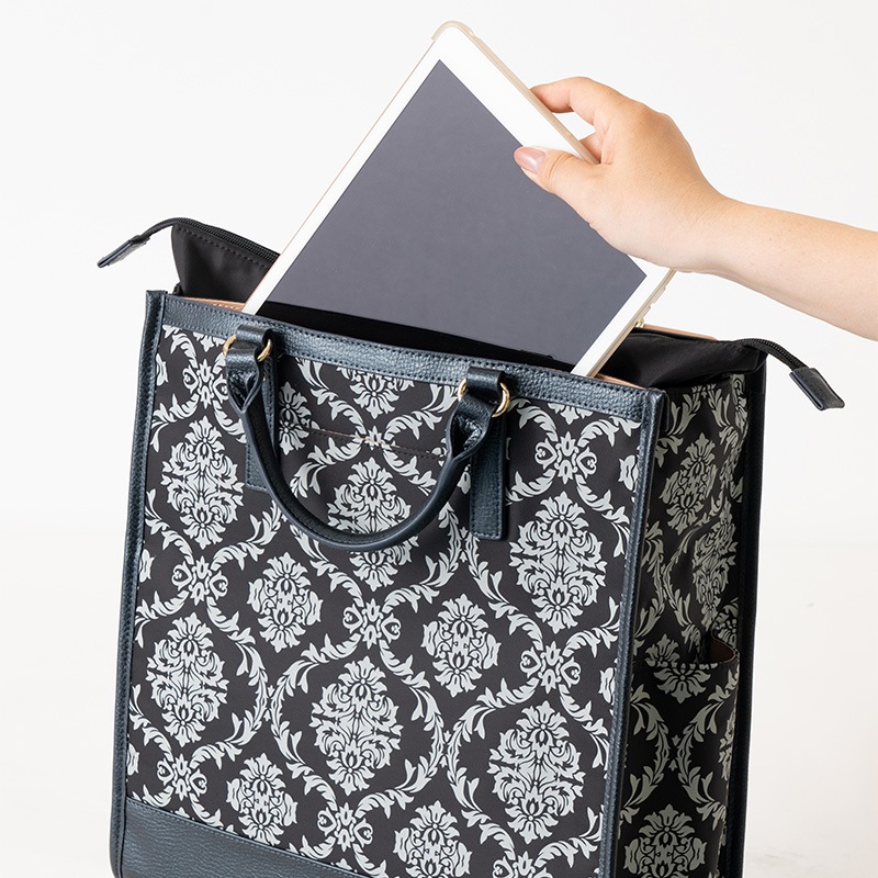 ・バッグは流行りのスラっとした縦型トートタイプでスリムなシルエットながら、あおりポケットやサイドポケットがあり、見た目以上に収納力に優れています。